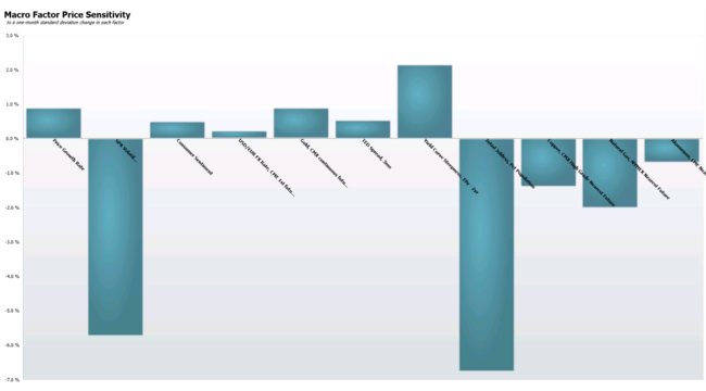 Never before available macro factor analytics. The macro data sets include the exact historical price sensitivity of each stock to movements in individual macro factors and an implied price based on historical and current macro conditions. For the first time, clients can build portfolios to reflect their exact macro outlook and hedge unintentional exposures.