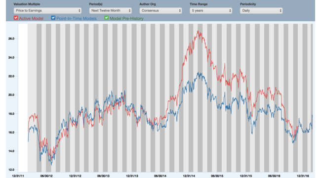 This data feed contains an exhaustive set of daily “rolling” historical point-in-time valuation series using Consensus Models™ for ultra-precise temporal matching of income with balance sheet positions. As well as, 20 daily high-order valuation series going back 10 years on a last year, next year and two years forward basis.